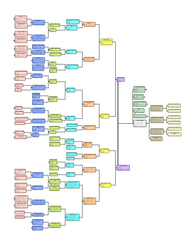 This hourglass chart is centered on a person or couple with their ancestors spreading out to the left and descendants to the right. The hourglass chart does not include siblings of the ancestors but it does include all the descendants below them including any spouses that have married into the family. This chart has boxes around the text and has different coloured generations